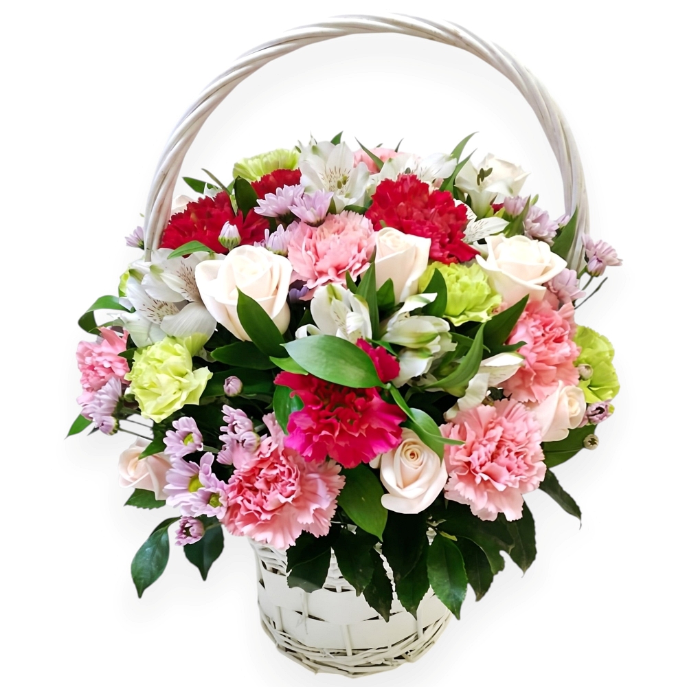 중국산: 동서양난과 관엽식물 일부, 비누꽃과 금장미 소재, 장미, 국화, 카네이션, 대국등과 바구니, 리본등의 부자재