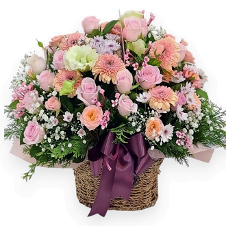 중국산: 동서양난과 관엽식물 일부, 비누꽃과 금장미 소재, 장미, 국화, 카네이션, 대국등과 바구니, 리본등의 부자재
