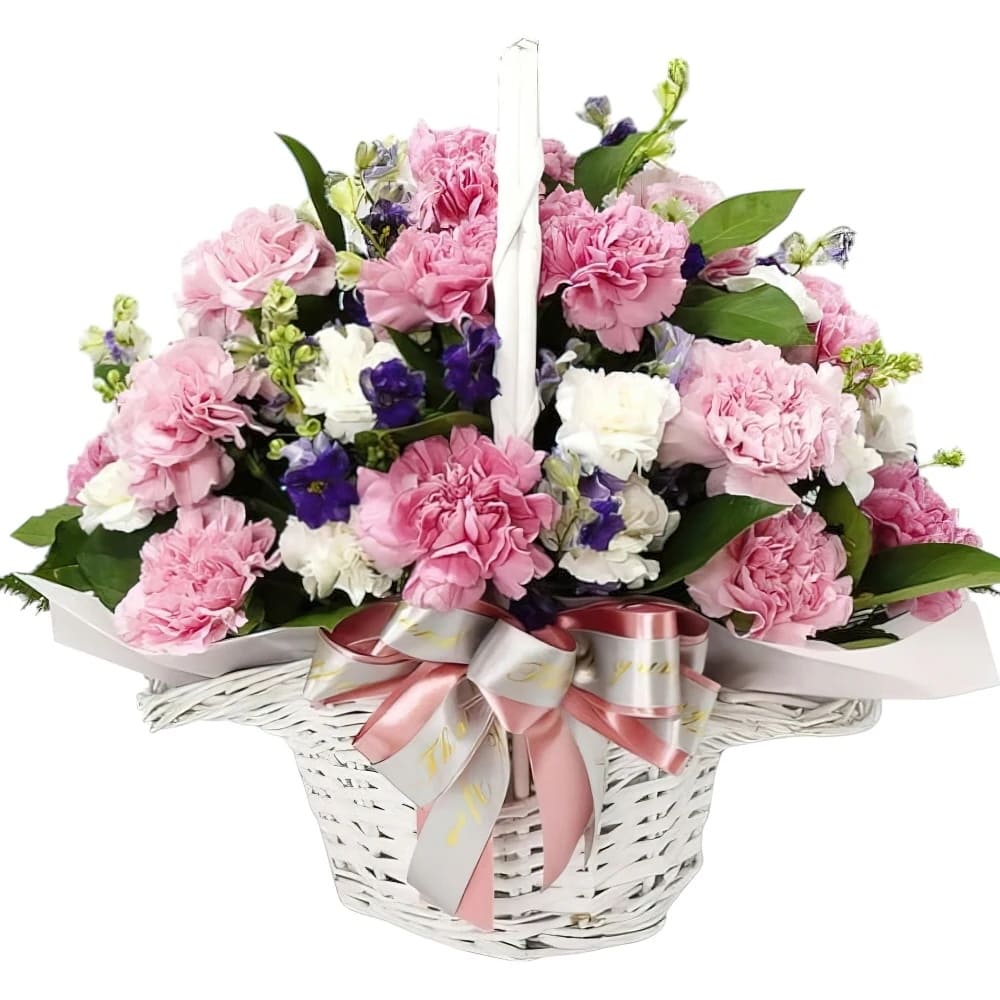 중국산: 동서양난과 관엽식물 일부, 비누꽃과 금장미 소재, 장미, 국화, 카네이션, 대국등과 바구니, 리본등의 부자재