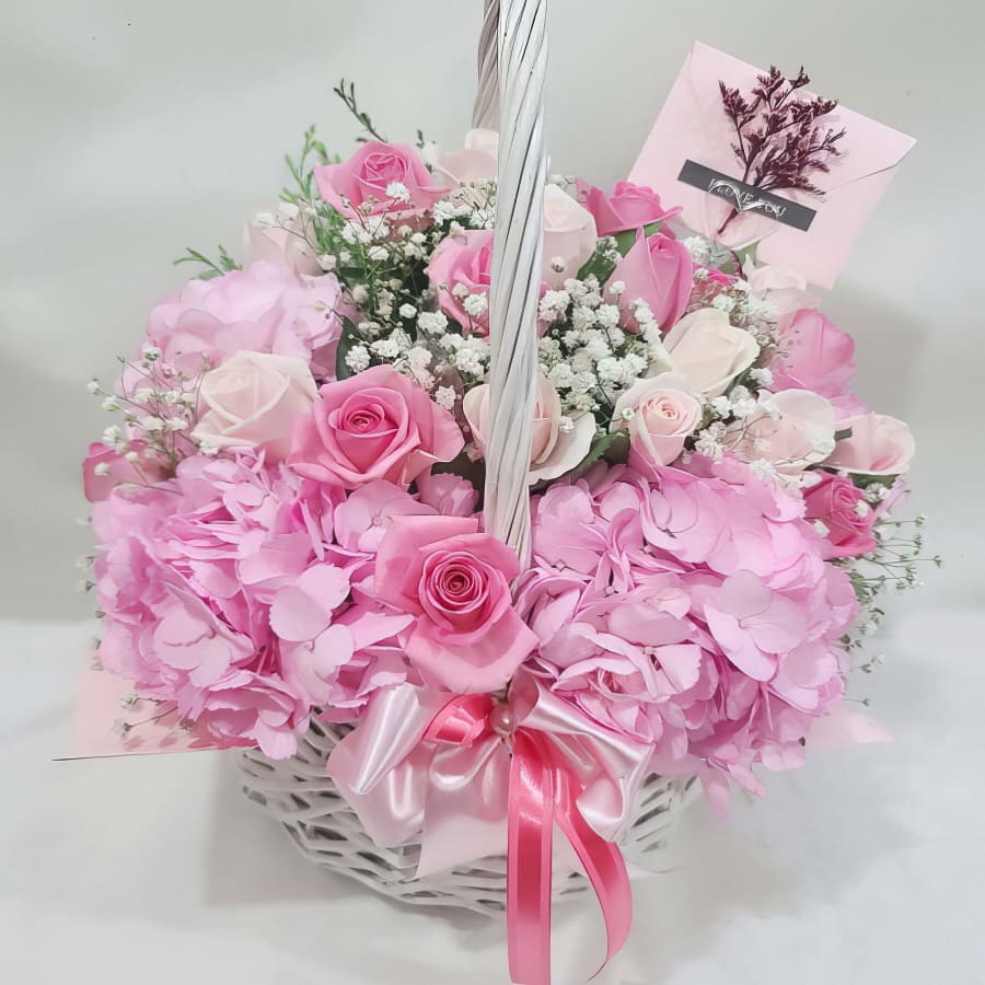 중국산: 동서양난과 관엽식물 일부, 비누꽃과 금장미 소재, 장미, 국화, 카네이션, 대국등과 바구니, 리본등의 부자재